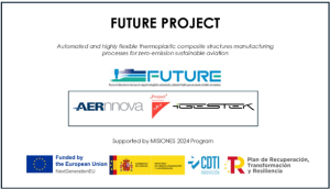 El proyecto FUTURE investiga procesos de fabricación de compuestos termoplásticos que permitan producir aeroestructuras de forma más sostenible, flexible y automatizada para nuevos modelos de aeronaves como UAVs, eVTOLs y aviones de un solo pasillo. La investigación cubre toda la cadena productiva —laminado, consolidación 2D, fabricación aditiva 3D y ensamblaje— y culminará en un demostrador que valide la fabricación sostenible de piezas termoplásticas con espesores variables, impulsando la economía circular.